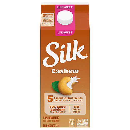 Treat yourself to this decadent and delightfully creamy Silk Unsweet Cashewmilk. Made with roasted cashews grown by Mother Nature and a touch of almond, this lactose free milk has a perfect mix of quality and flavor. Enjoy all of the taste with 0 grams of sugar per serving. It's an extraordinary tasting plant based milk that you can use throughout your day. Every serving of this nondairy milk has 50% more calcium than dairy milk. Add creaminess for only 25 calories. Silk Cashewmilk is an excellent substitution to baking recipes or addition to snacks. Plus, it’s totally free of dairy, gluten, carrageenan and cholesterol. Looking for lactose free cooking or baking supplies? Whether you’re making cookies, cakes or cornbread, trust Silk — the Original Plant Pioneer. Read more about our story on our packaging. Enjoy all of the Silk products, including vegan milk, non dairy creamer and dairy free yogurt varieties. *Silk Cashewmilk: 470mg of calcium per cup; reduced fat dairy milk: 309mg of calcium per cup. USDA National Nutrient Database for Standard Reference, 2022.