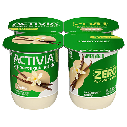 Start your day with your gut health in mind with Activia ZERO 0g Added Sugar* Vanilla Probiotic Nonfat Yogurt. Backed by 20 years of gut health research, this delicious vanilla flavored yogurt contains billions of probiotics and 0 grams of added sugar.* Probiotics are living microorganisms that provide specific health benefits, including supporting gut health.*** Each vanilla flavored yogurt cup has 0 grams of fat, and 50 calories per serving. Enjoy these 0g added sugar* yogurt cups as part of your breakfast, grab and go snacks, or as an addition to your yogurt smoothie. ***Enjoying Activia twice a day for two weeks as part of a balanced diet and healthy lifestyle may help reduce the frequency of minor digestive discomfort, which includes gas, bloating, rumbling, and abdominal discomfort.