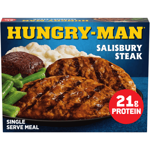 Enjoy classic home-style flavors and satisfy your comfort food cravings with Hungry-Man Salisbury Steak. Dig into an easy-to-prepare frozen meal featuring Salisbury steak in home-style mushroom and onion gravy, creamy mashed potatoes and green bean side dishes, and a rich chocolate brownie dessert. With 21 grams of protein per serving, this frozen food offers a home-style recipe for satisfying frozen entrees that are ready to eat anytime hunger strikes. Whether you're looking for convenient lunches to bring to work, a hearty TV dinner or easy meals that are ready to eat in minutes, Hungry-Man microwave meals are a great choice to tackle those tummy rumbles. Simply follow the instructions on the package to microwave or prepare these quick meals in a conventional oven. Each package contains one full meal that is perfect for busy lifestyles and hearty appetites. Store the convenient frozen meals in your freezer until you're ready to enjoy. Try other Hungry-Man frozen meals to find your favorite. Hungry-Man offers big portions for big appetites.
